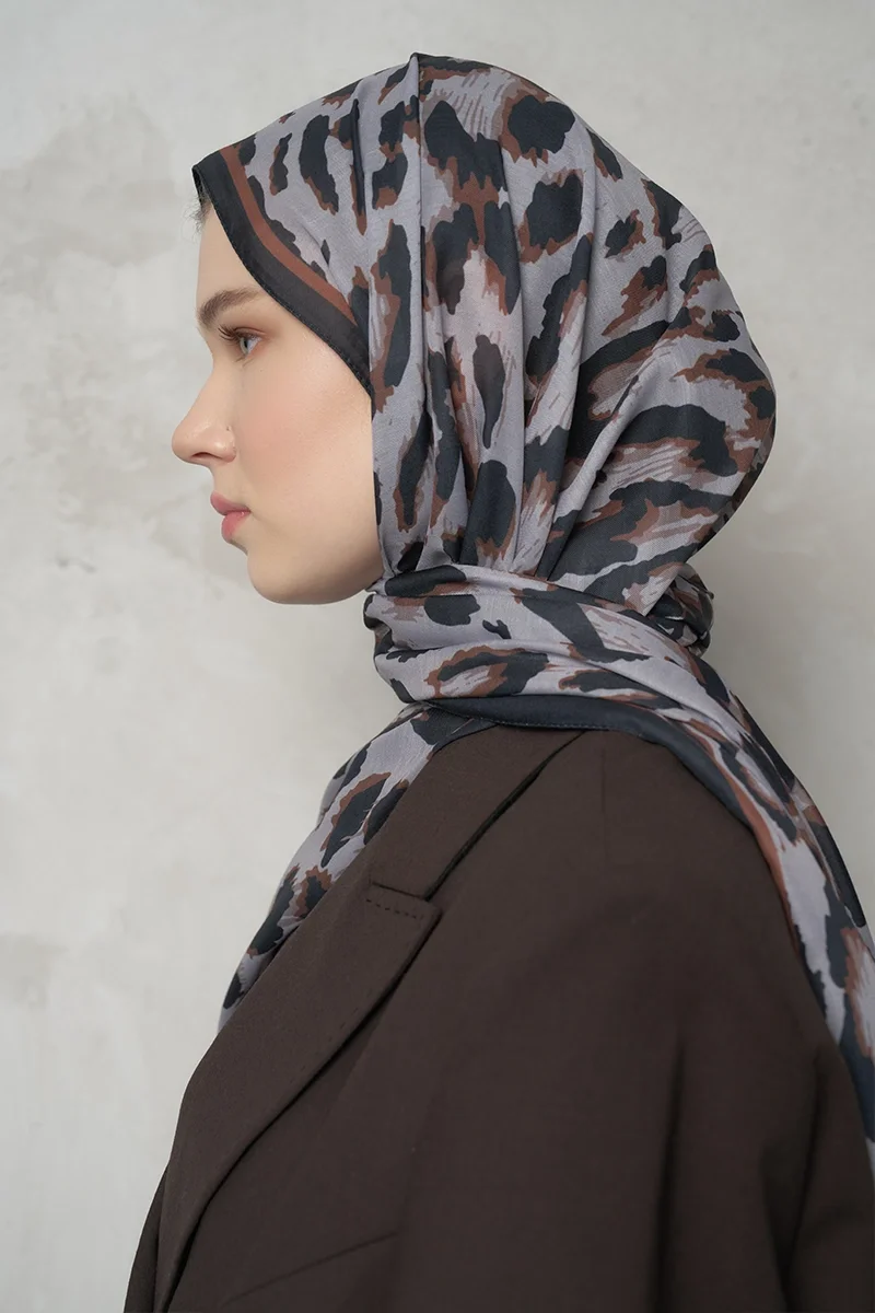Leopar Desenli Pamuk Dokulu Şal - Gri