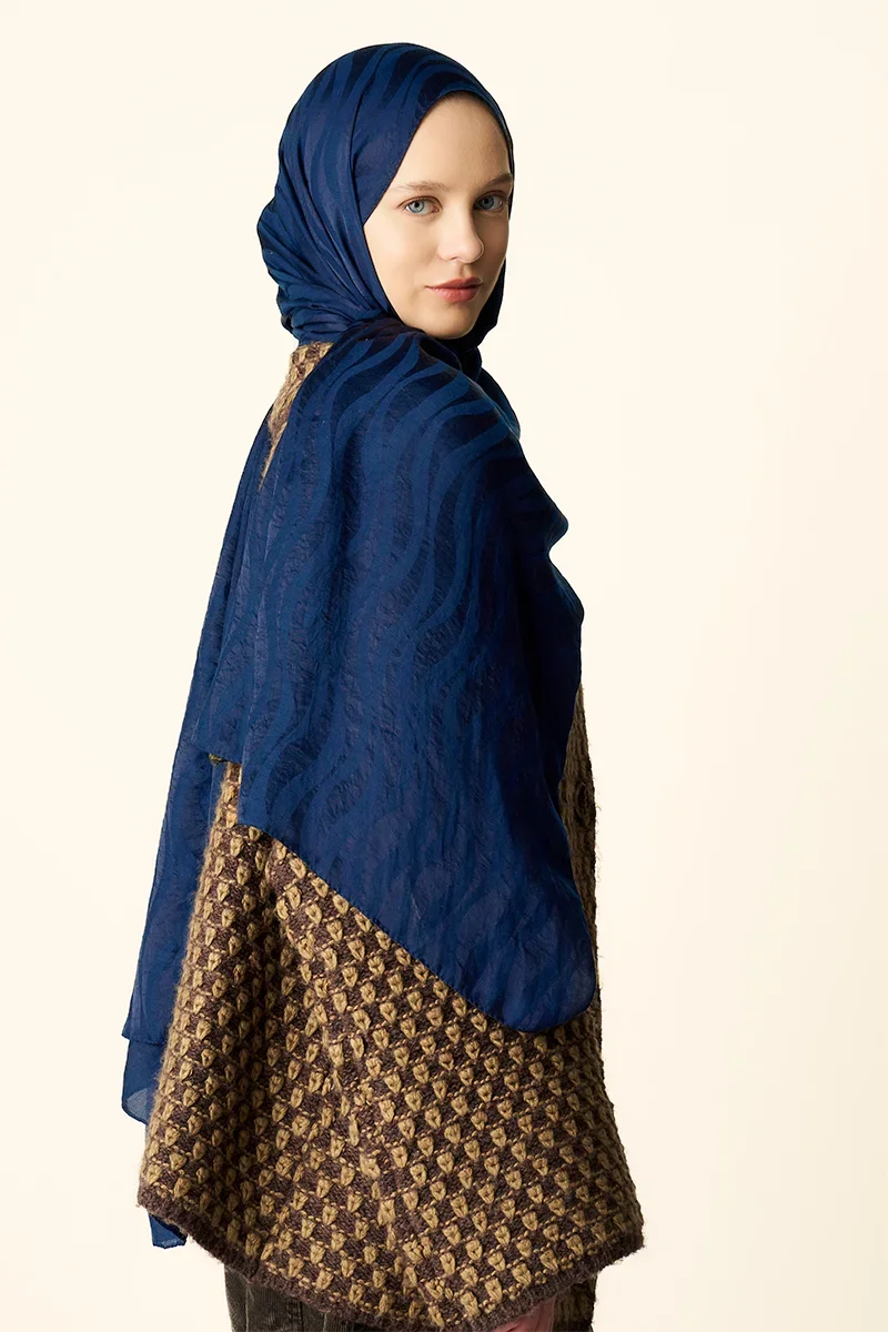 Premium Jakar Şal Dalga Desen - Gece Mavisi