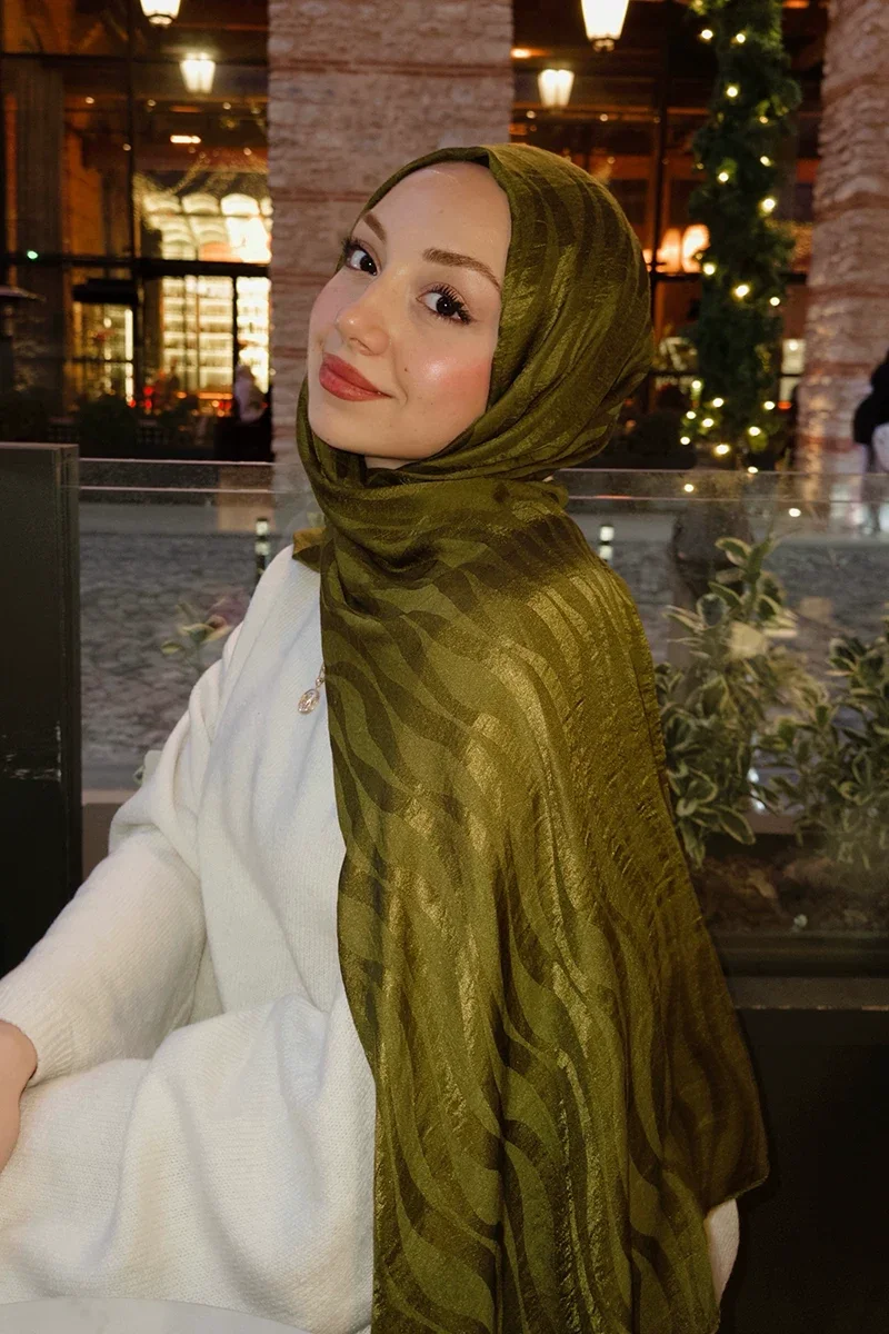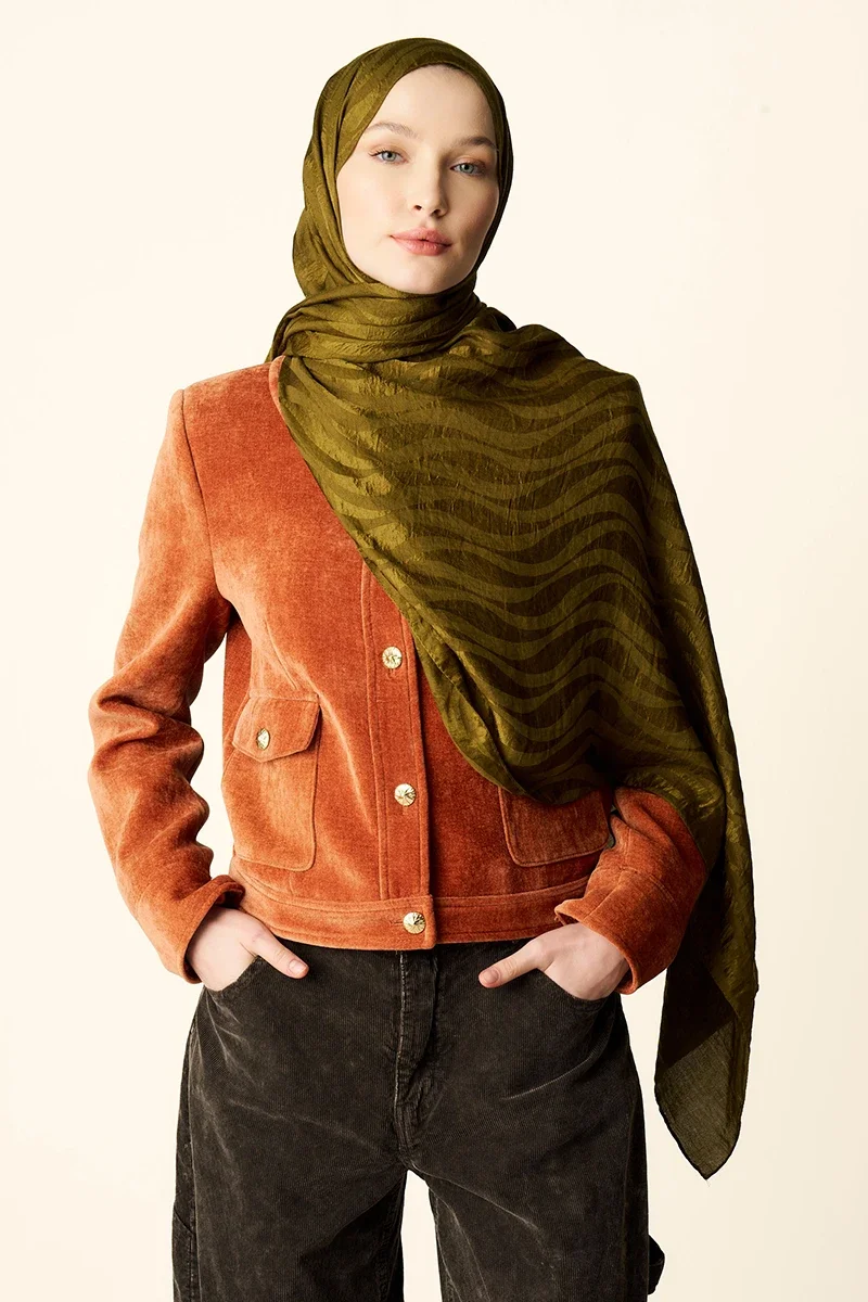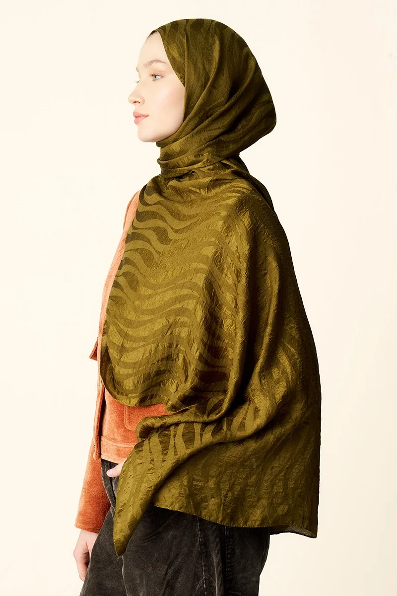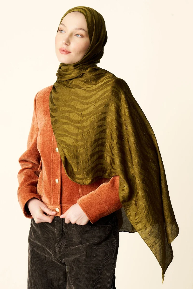 Premium Jakar Şal Dalga Desen - Yağ Yeşili